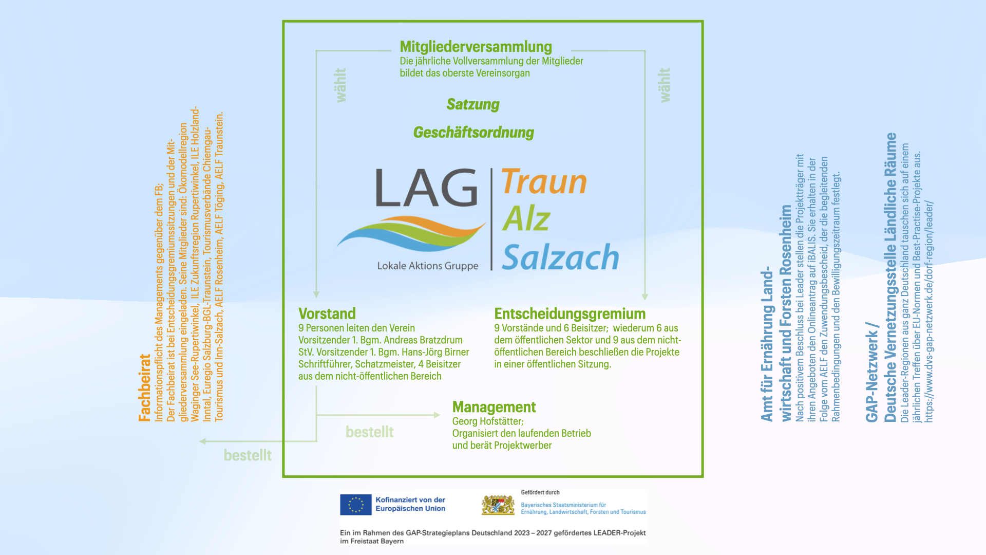 26 oberbayerischen Städte und Gemeinden aus den Landkreisen Traunstein und Altötting haben sich zusammengeschlossen und bilden die Lokale Aktionsgruppe LEADER Traun-Alz-Salzach. Die LAG LEADER Traun-Alz-Salzach ist ein eingetragener Verein. Der Verein wurde 2014 mit 15 Kommunen gegründet und hat erfolgreich an der Förderperiode 2014-2022 teilgenommen. Eine Besonderheit der LAG LEADER Traun-Alz-Salzach ist die hohe Beteiligung von 84 privaten Mitgliedern im Verein.